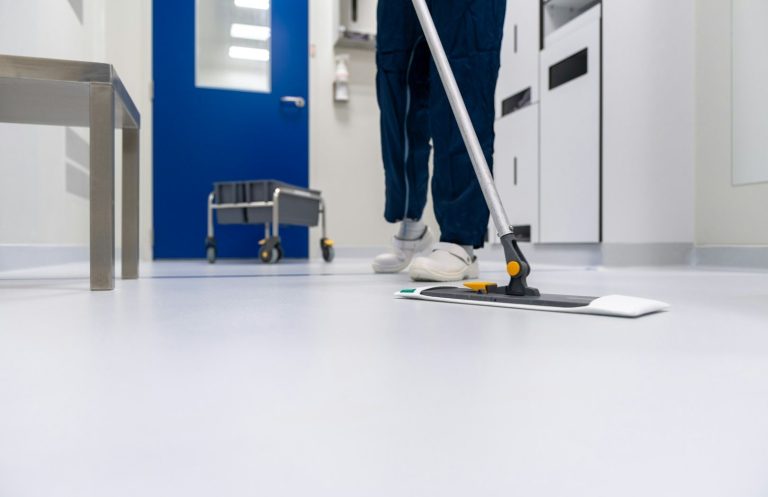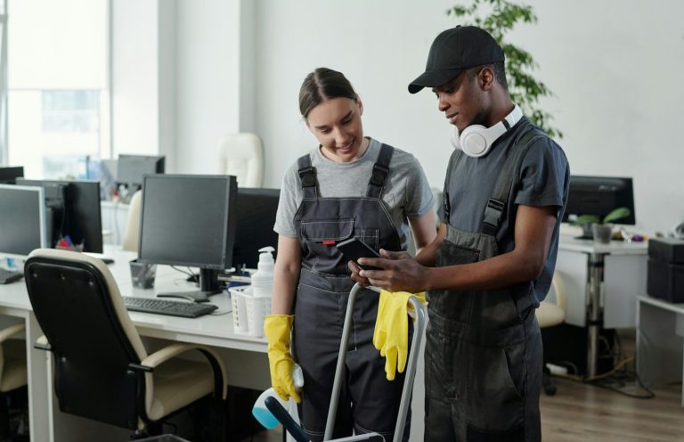 Gründliche Reinigung von Arbeitsflächen, Böden, Sanitäranlagen und Gemeinschaftsbereichen in Büros.